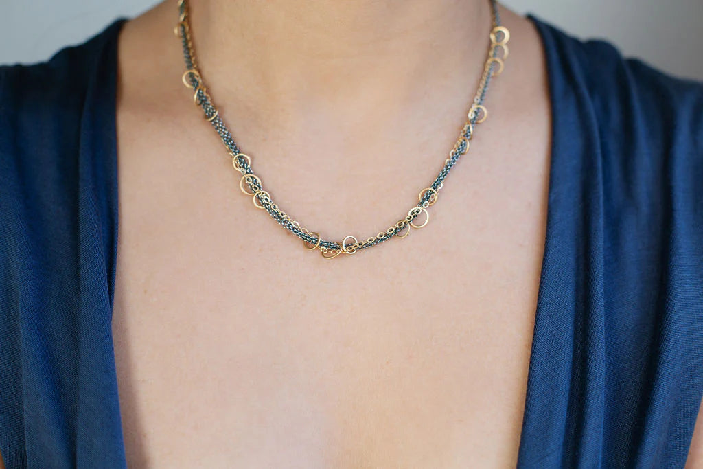 The Half Circle Curved Ring plays with geometric form, creating a crisp design that allows its bling to shine through its ordered circles. Artist Belle Brooke enjoys working with pattern, movement, and rhythm, and this piece exemplifies the harmonious blending of all these factors into an exquisitely crafted design. The ring also offers utility, allowing the wearer to showcase its beauty alone or stack it with another band.